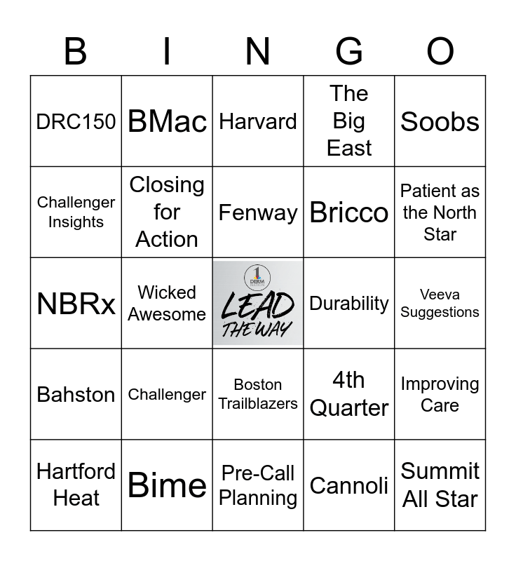 This bingo card has a free space and 24 words: Challenger, Bime, Fenway, Hartford Heat, Soobs, DRC150, Challenger Insights, BMac, Durability, Boston Trailblazers, Bricco, NBRx, 4th Quarter, Improving Care, Closing for Action, Cannoli, Veeva Suggestions, Harvard, Patient as the North Star, Wicked Awesome, Summit All Star, Bahston, The Big East and Pre-Call Planning.