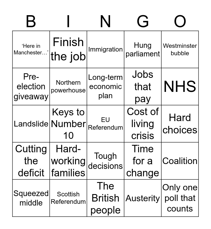 This bingo card has 25 words: Hard-working families, The British people, Long-term economic plan, Squeezed middle, Westminster bubble, ‘Here in Manchester…’, Pre-election giveaway, Finish the job, Cost of living crisis, Tough decisions, Jobs that pay, Landslide, Time for a change, Coalition, Northern powerhouse, Only one poll that counts, Hard choices, Immigration, NHS, Keys to Number 10, EU Referendum, Scottish Referendum, Cutting the deficit, Hung parliament and Austerity.