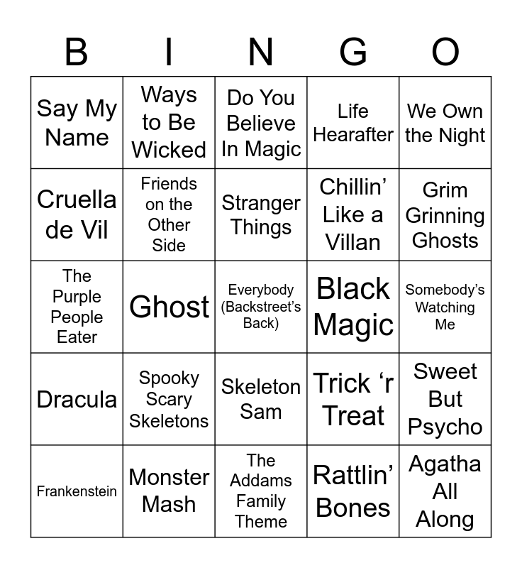 This bingo card has 30 words: Monster Mash, Jaws, Ghost, Hedwig’s Theme, Say My Name, Do You Believe In Magic, Friends on the Other Side, Skeleton Sam, Black Magic, The Addams Family Theme, Somebody’s Watching Me, Everybody (Backstreet’s Back), Rattlin’ Bones, Agatha All Along, Grim Grinning Ghosts, Walking Dead, Trick ‘r Treat, Dracula, Spooky Scary Skeletons, We Own the Night, The Purple People Eater, I Put a Spell on You, Ways to Be Wicked, Chillin’ Like a Villan, Cruella de Vil, Life Hearafter, Sweet But Psycho, Frankenstein, Stranger Things and Oogie Boogie’s Song.
