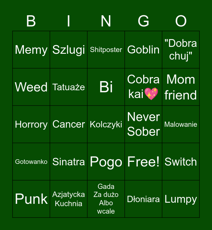 This bingo card has 25 words: Sinatra, Gada Za dużo Albo wcale, Bi, Punk, "Dobra chuj", Memy, Weed, Szlugi, Never Sober, Pogo, Cobra kai💖, Horrory, Free!, Switch, Tatuaże, Lumpy, Malowanie, Shitposter, Mom friend, Cancer, Kolczyki, Azjatycka Kuchnia, Gotowanko, Goblin and Dłoniara.