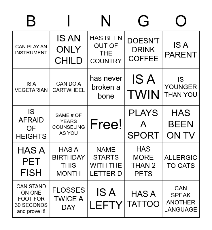 This bingo card has a free space and 28 words: ALLERGIC TO CATS, HAS MORE THAN 3 SIBLINGS, IS A TWIN, HAS A TATTOO, IS A VEGETARIAN, HAS BEEN OUT OF THE COUNTRY, IS AN ONLY CHILD, HAS A PET FISH, PLAYS A SPORT, CAN STAND ON ONE FOOT FOR 30 SECONDS and prove it!, IS AFRAID OF HEIGHTS, DOESN'T DRINK COFFEE, FLOSSES TWICE A DAY, IS A LEFTY, IS YOUNGER THAN YOU, DOESN'T HAVE AN IPHONE, HAS A BIRTHDAY THIS MONTH, CAN DO A CARTWHEEL, has never broken a bone, NAME STARTS WITH THE LETTER D, CAN PLAY AN INSTRUMENT, GREW UP OUTSIDE OF NEW ENGLAND, CAN SPEAK ANOTHER LANGUAGE, SAME # OF YEARS COUNSELING AS YOU, HAS BEEN ON TV, HAS MORE THAN 2 PETS, IS A PARENT and MEDITATES REGULARLY.