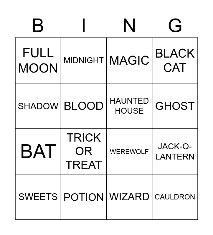 This bingo card has 28 words: Free!, CHOCOLATE, BAT, SKULL, BLOOD, MAGIC, MIDNIGHT, CAULDRON, POTION, VAMPIRE, WEREWOLF, BLACK CAT, WITCH, PUMPKIN, TRICK OR TREAT, SKELETON, BROOM, HAUNTED HOUSE, GHOST, SPIDER, FULL MOON, COSTUME, SWEETS, JACK-O-LANTERN, WIZARD, SCREAM, SHADOW and MONSTER.