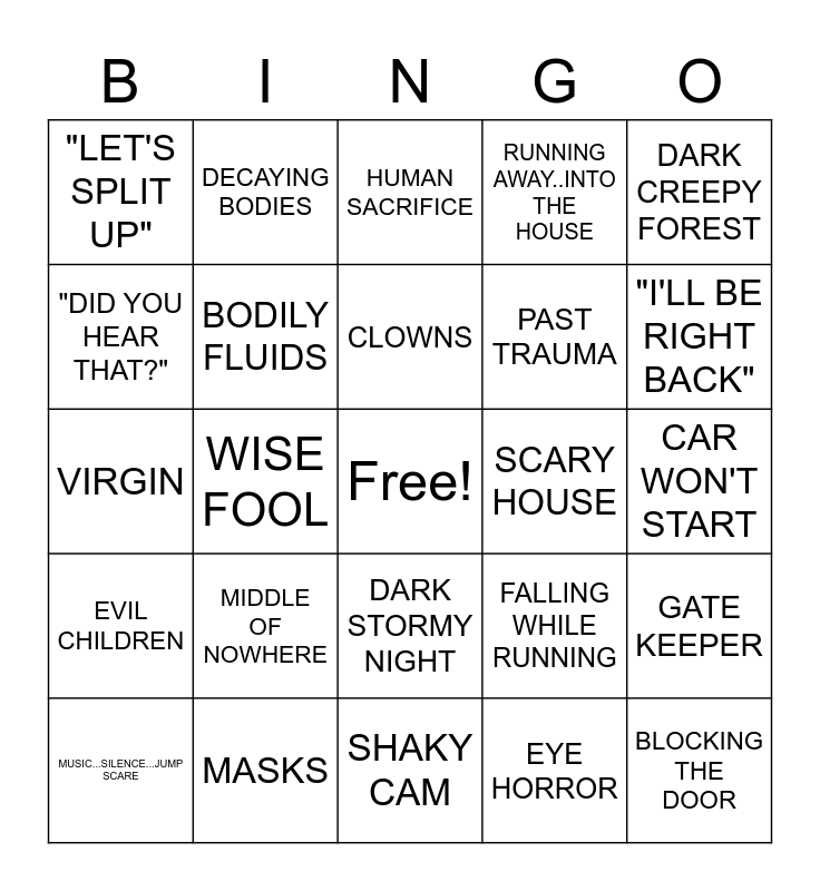 This bingo card has a free space and 24 words: MIDDLE OF NOWHERE, MASKS, CLOWNS, MUSIC...SILENCE...JUMP SCARE, DARK CREEPY FOREST, "LET'S SPLIT UP", "DID YOU HEAR THAT?", DECAYING BODIES, SCARY HOUSE, DARK STORMY NIGHT, PAST TRAUMA, VIRGIN, FALLING WHILE RUNNING, GATE KEEPER, BODILY FLUIDS, EYE HORROR, CAR WON'T START, HUMAN SACRIFICE, "I'LL BE RIGHT BACK", WISE FOOL, BLOCKING THE DOOR, EVIL CHILDREN, RUNNING AWAY..INTO THE HOUSE and SHAKY CAM.
