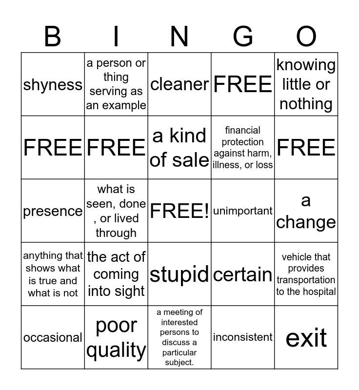 This bingo card has a free space and 24 words: the act of coming into sight, poor quality, a kind of sale, occasional, knowing little or nothing, shyness, FREE, a person or thing serving as an example, unimportant, stupid, financial protection against harm, illness, or loss, presence, certain, vehicle that provides transportation to the hospital, FREE, inconsistent, a change, cleaner, FREE, what is seen, done , or lived through, exit, anything that shows what is true and what is not, FREE and a meeting of interested persons to discuss a particular subject..