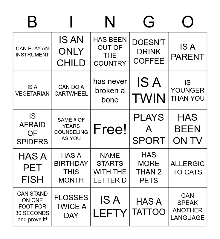 This bingo card has a free space and 28 words: ALLERGIC TO CATS, HAS MORE THAN 3 SIBLINGS, IS A TWIN, HAS A TATTOO, IS A VEGETARIAN, HAS BEEN OUT OF THE COUNTRY, IS AN ONLY CHILD, HAS A PET FISH, PLAYS A SPORT, CAN STAND ON ONE FOOT FOR 30 SECONDS and prove it!, IS AFRAID OF SPIDERS, DOESN'T DRINK COFFEE, FLOSSES TWICE A DAY, IS A LEFTY, IS YOUNGER THAN YOU, DOESN'T HAVE AN IPHONE, HAS A BIRTHDAY THIS MONTH, CAN DO A CARTWHEEL, has never broken a bone, NAME STARTS WITH THE LETTER D, CAN PLAY AN INSTRUMENT, GREW UP OUTSIDE OF NEW ENGLAND, CAN SPEAK ANOTHER LANGUAGE, SAME # OF YEARS COUNSELING AS YOU, HAS BEEN ON TV, HAS MORE THAN 2 PETS, IS A PARENT and MEDITATES REGULARLY.