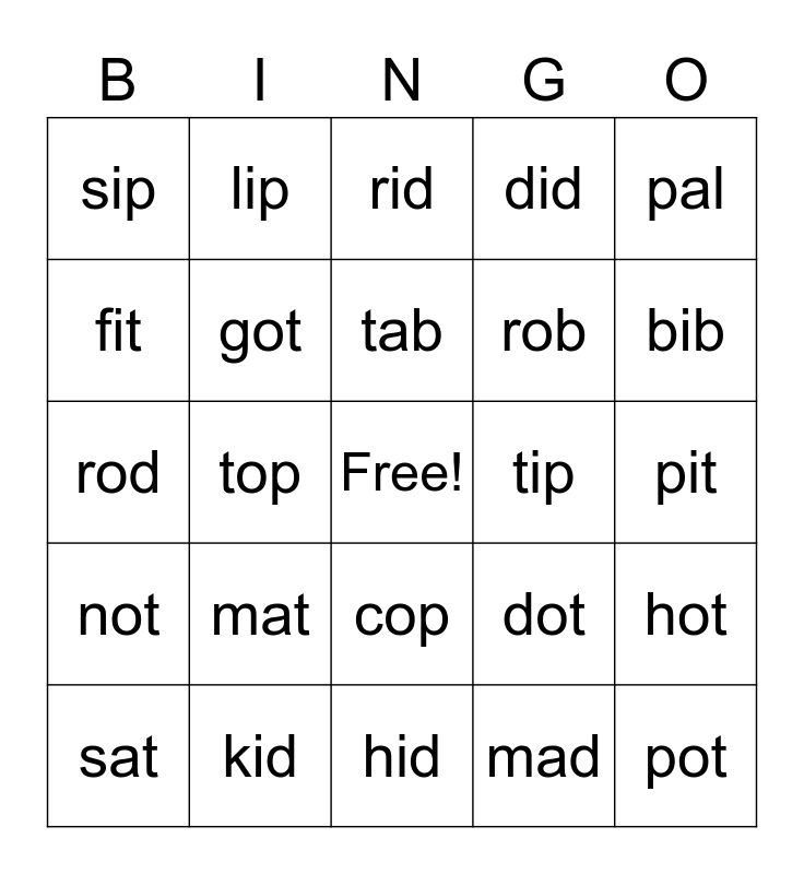 This bingo card has a free space and 24 words: sat, mat, tab, mad, pal, sip, lip, rid, tip, pit, rod, got, dot, hot, fit, kid, hid, did, bib, not, top, cop, rob and pot.