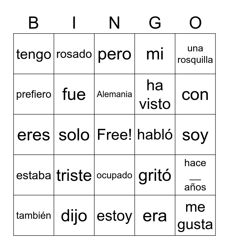 This bingo card has a free space and 34 words: había, era, quería, tenía, estaba, fue, una rosquilla, también, rosado, vivía, Alemania, pero, vive, ir de vacaciones, habló, con, dijo, eres, triste, gritó, ocupado, porque, tengo, soy, estoy, me gusta, mi, ha ido, ha visto, prefiero, fui, solo, hace __ años and novio.