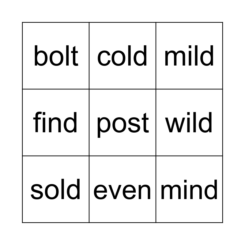 This bingo card has a free space and 8 words: wild, mild, cold, sold, bolt, mind, find and even.