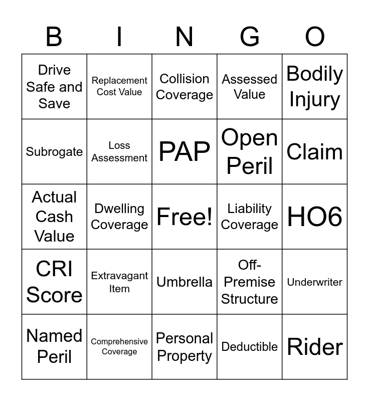 This bingo card has a free space and 24 words: Extravagant Item, Comprehensive Coverage, PAP, Named Peril, Bodily Injury, Drive Safe and Save, Subrogate, Replacement Cost Value, Liability Coverage, Umbrella, Open Peril, Actual Cash Value, Off-Premise Structure, Underwriter, Loss Assessment, Deductible, HO6, Collision Coverage, Claim, Dwelling Coverage, Rider, CRI Score, Assessed Value and Personal Property.