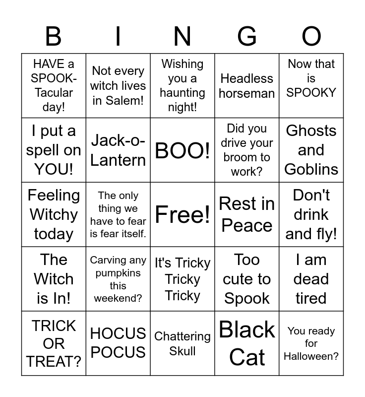 This bingo card has a free space and 24 words: Carving any pumpkins this weekend?, HOCUS POCUS, BOO!, TRICK OR TREAT?, Now that is SPOOKY, HAVE a SPOOK-Tacular day!, I put a spell on YOU!, Not every witch lives in Salem!, Rest in Peace, It's Tricky Tricky Tricky, Did you drive your broom to work?, Feeling Witchy today, Too cute to Spook, I am dead tired, Jack-o-Lantern, Black Cat, Don't drink and fly!, Wishing you a haunting night!, Ghosts and Goblins, The only thing we have to fear is fear itself., You ready for Halloween?, The Witch is In!, Headless horseman and Chattering Skull.