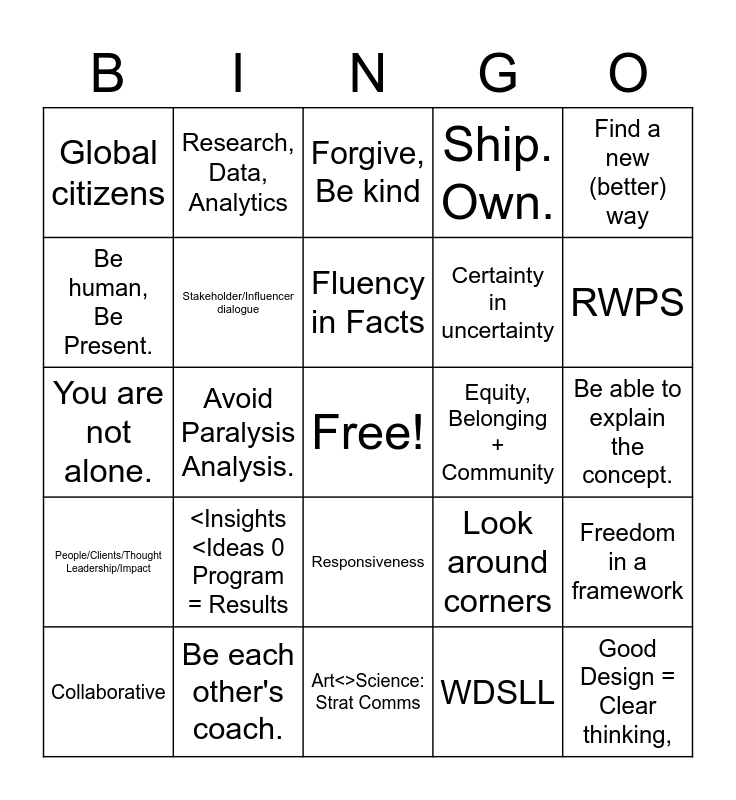 This bingo card has a free space and 28 words: Freedom in a framework, Confidence in ambiguity, Certainty in uncertainty, WDSLL, Be human, Be Present., Forgive, Be kind, Research, Data, Analytics, People/Clients/Thought Leadership/Impact, Equity, Belonging + Community, Collaborative, You are not alone., Ship. Own., Be each other's coach., Art<>Science: Strat Comms, RWPS, Look around corners, <Insights <Ideas 0 Program = Results, Stakeholder/Influencer dialogue, Fluency in Facts, Responsiveness, Global citizens, Move fast, think big., Good Design = Clear thinking,, Avoid Paralysis Analysis., Be able to explain the concept., Look around corners, Find a new (better) way and Bullets, Outline, Page numbers.