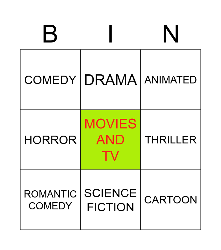 This bingo card has a free space and 17 words: ACTION, ADVENTURE, ANIMATED, COMEDY, FANTASY, HORROR, MUSICAL, ROMANTIC COMEDY, SCIENCE FICTION, THRILLER, WAR, WESTERN, CARTOON, DRAMA, GAME SHOW, THE NEWS and REALITY SHOW.