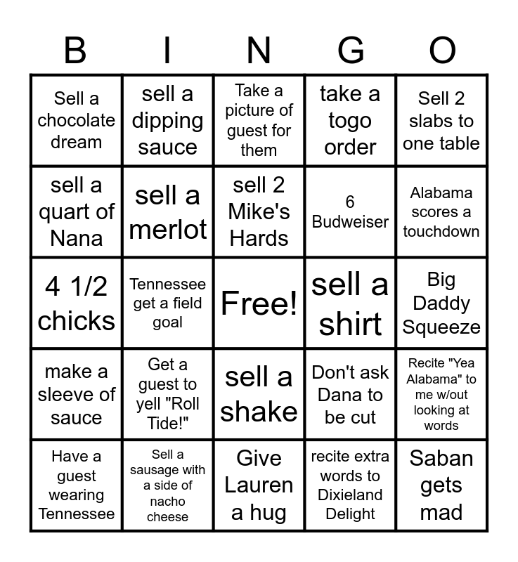 This bingo card has a free space and 24 words: Get a guest to yell "Roll Tide!", Sell a sausage with a side of nacho cheese, sell 2 Mike's Hards, Have a guest wearing Tennessee, Sell 2 slabs to one table, Sell a chocolate dream, sell a quart of Nana, sell a dipping sauce, sell a shirt, sell a shake, 6 Budweiser, 4 1/2 chicks, Don't ask Dana to be cut, Recite "Yea Alabama" to me w/out looking at words, sell a merlot, recite extra words to Dixieland Delight, Big Daddy Squeeze, Take a picture of guest for them, Alabama scores a touchdown, Tennessee get a field goal, Saban gets mad, make a sleeve of sauce, take a togo order and Give Lauren a hug.