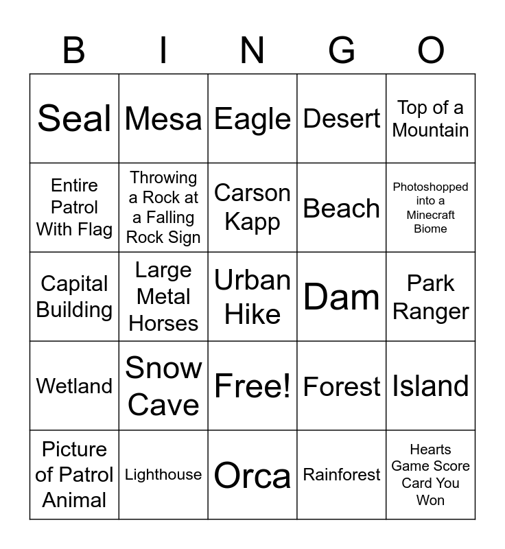 This bingo card has 26 words: Free!, Rainforest, Carson Kapp, Lighthouse, Top of a Mountain, Seal, Entire Patrol With Flag, Mesa, Park Ranger, Forest, Beach, Capital Building, Island, Picture of Patrol Animal, Large Metal Horses, Columbia River, Desert, Wetland, Eagle, Urban Hike, Photoshopped into a Minecraft Biome, Orca, Dam, Snow Cave, Throwing a Rock at a Falling Rock Sign and Hearts Game Score Card You Won.