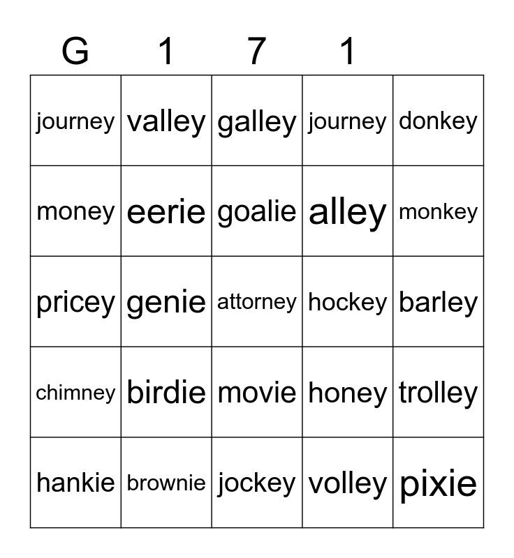 This bingo card has a free space and 24 words: birdie, brownie, goalie, hankie, donkey, journey, money, valley, hockey, movie, alley, pricey, honey, trolley, eerie, volley, barley, galley, monkey, genie, pixie, chimney, journey and jockey.