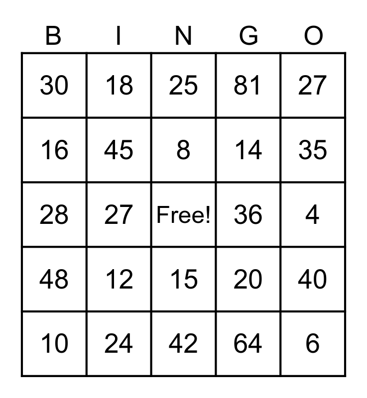 This bingo card has a free space and 24 words: 12, 24, 8, 10, 27, 30, 16, 18, 36, 15, 14, 28, 20, 40, 45, 64, 4, 25, 35, 27, 6, 48, 81 and 42.