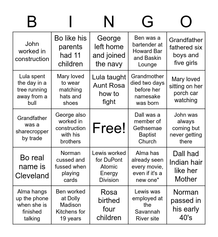 This bingo card has a free space and 25 words: Alma hangs up the phone when she is finished talking, Norman cussed and fussed when playing cards, Lula taught Aunt Rosa how to fight, Lewis was employed at the Savannah River site, Mary loved sitting on her porch car watching, John worked in construction, Bo like his parents had 11 children, George left home and joined the navy, Grandmother died two days before her namesake was born, Dall had Indian hair like her Mother, Grandfather was a sharecropper by trade, Mary loved to wear matching hats and shoes, Alma has already seen every movie, even if it's a new one", Norman passed in his early 40's, Lula spent the day in a tree running away from a bull, Ben worked at Dolly Madison Kitchens for 19 years, Rosa birthed four children, Ben was a bartender at Howard Bar and Baskin Lounge, John was always coming but never getting there, Bo real name is Cleveland, George also worked in construction with his brothers, Lewis worked for DuPont Atomic Energy Division, Dall was a member of Gethsemae Baptist Church, Grandfather fathered six boys and five girls and Grandmother died in Savannah.
