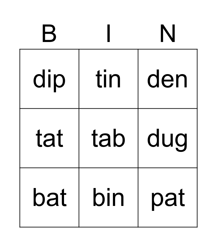 This bingo card has 9 words: bat, den, tin, tat, dip, dug, tab, pat and bin.