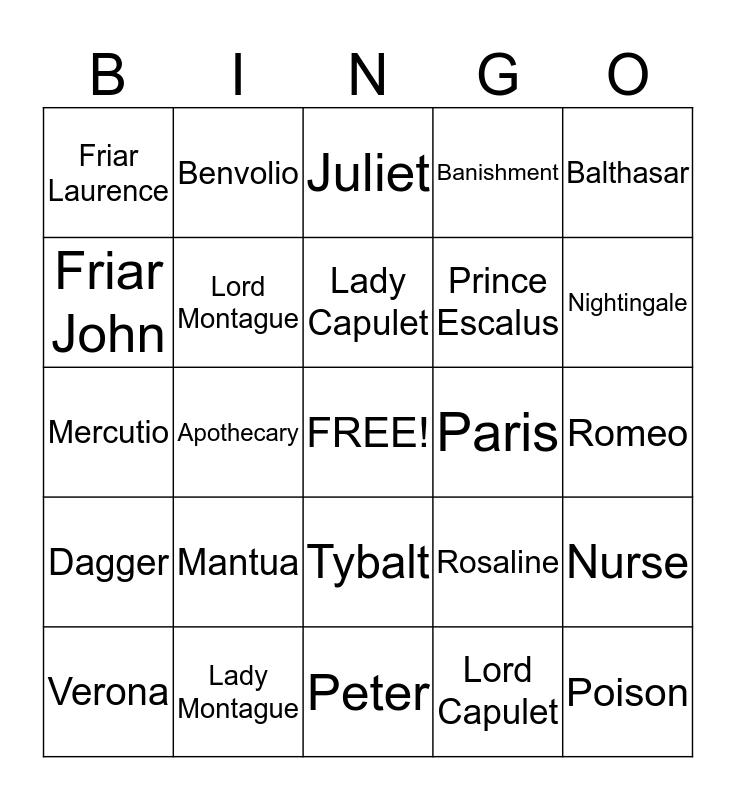 This bingo card has a free space and 24 words: Mantua, Lady Montague, Lady Capulet, Verona, Balthasar, Friar Laurence, Friar John, Benvolio, Paris, Tybalt, Prince Escalus, Mercutio, Rosaline, Nurse, Lord Montague, Lord Capulet, Romeo, Juliet, Nightingale, Apothecary, Poison, Dagger, Banishment and Peter.