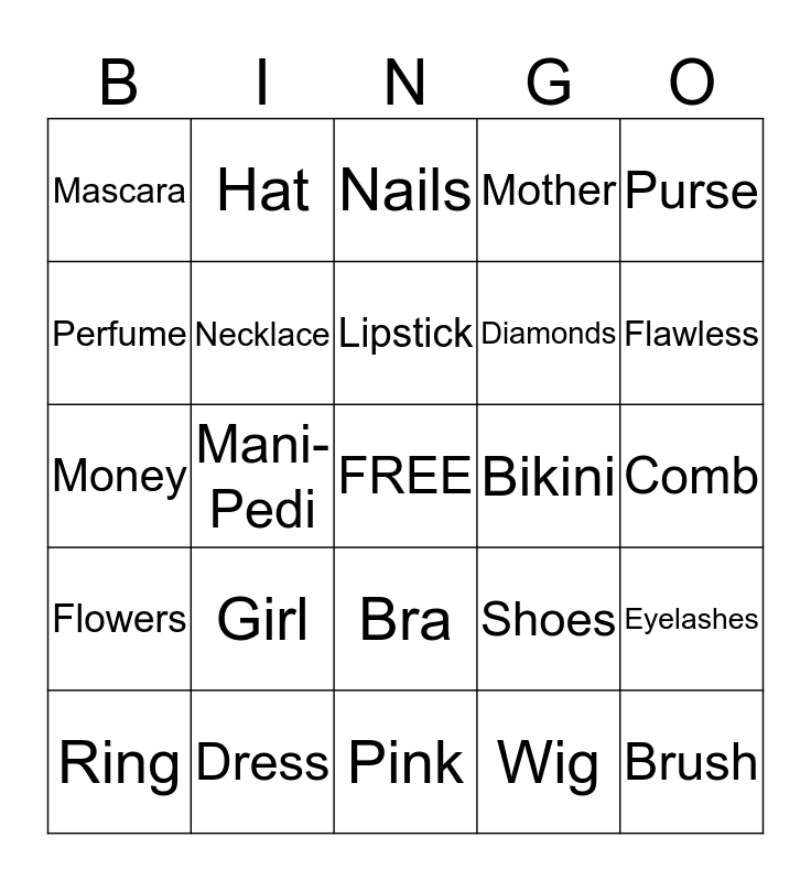 This bingo card has a free space and 24 words: Girl, Dress, Lipstick, Ring, Purse, Mascara, Perfume, Hat, Bikini, Bra, Diamonds, Money, Shoes, Eyelashes, Necklace, Wig, Comb, Nails, Flawless, Mani-Pedi, Brush, Flowers, Mother and Pink.