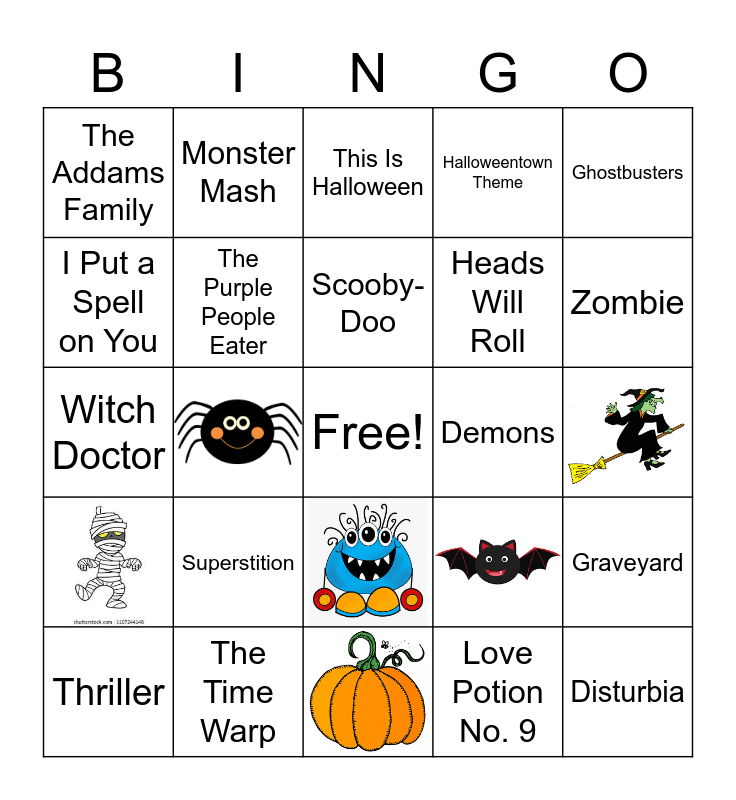 This bingo card has 10 images, a free space and 21 words: She Wolf, The Addams Family, This Is Halloween, The Purple People Eater, Demons, Love Potion No. 9, Disturbia, Banana Boat, Zombie, Graveyard, Superstition, Ghostbusters, Thriller, Monster Mash, Heads Will Roll, I Put a Spell on You, Halloweentown Theme, Witch Doctor, The Time Warp, Scooby-Doo and (Don’t Fear) The Reaper.