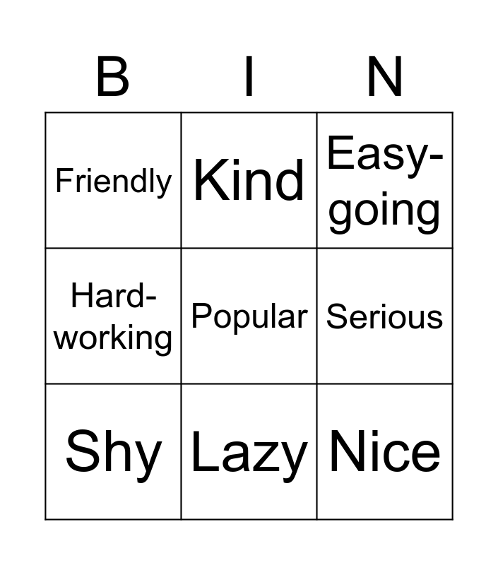 This bingo card has 18 words: Chatty, Clever, Easy-going, Friendly, Funny, Hard-working, Honest, Kind, Lazy, Nice, Polite, Popular, Quiet, Serious, Shy, Silly, Smart and Untidy.