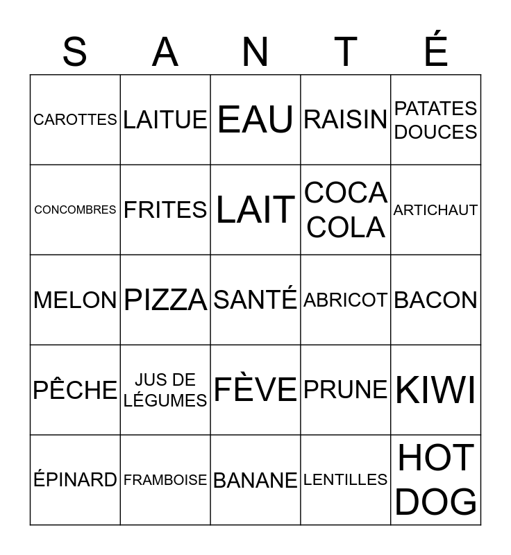 This bingo card has a free space and 24 words: JUS DE LÉGUMES, FRAMBOISE, LAIT, ÉPINARD, PATATES DOUCES, CAROTTES, CONCOMBRES, LAITUE, ABRICOT, FÈVE, COCA COLA, MELON, PRUNE, KIWI, FRITES, LENTILLES, BACON, EAU, ARTICHAUT, PIZZA, HOT DOG, PÊCHE, RAISIN and BANANE.