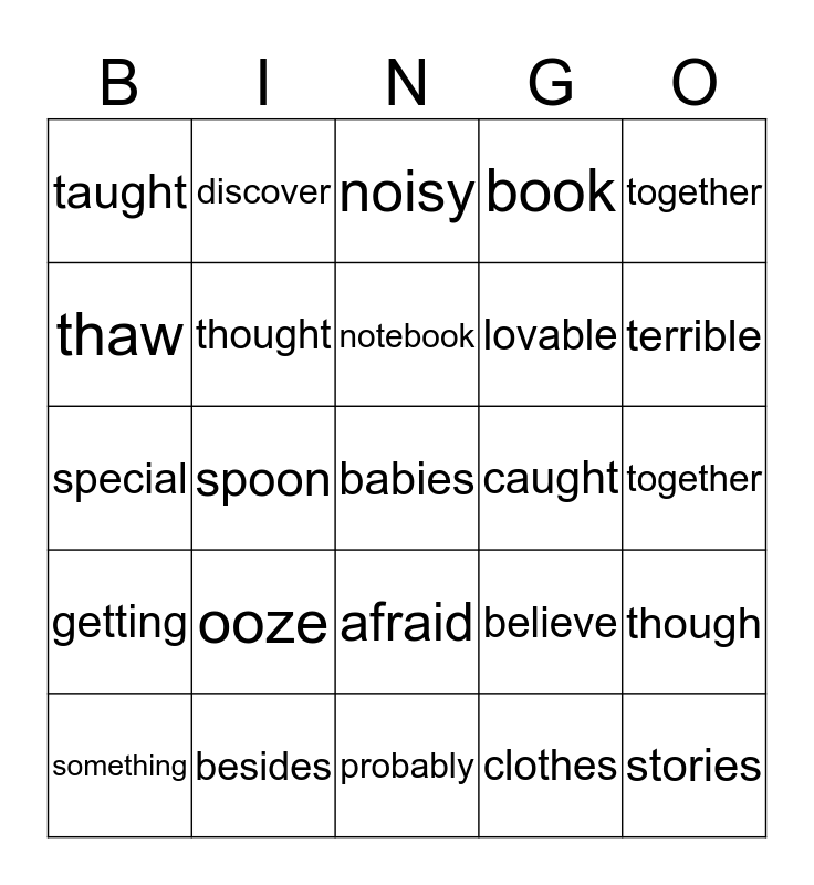 This bingo card has a free space and 37 words: villages, another, through, thought, though, ooze, notebook, goodbye, together, sure, spoon, book, stories, together, thaw, getting, snowy, noisy, afraid, caught, taught, terrible, something, probably, conclude, clothes, discover, country, enough, question, become, besides, special, friendly, believe, lovable and anyone.