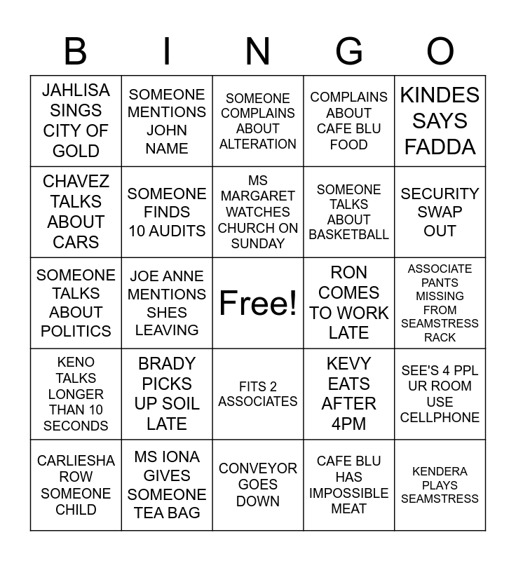 This bingo card has a free space and 24 words: BRADY PICKS UP SOIL LATE, MS IONA GIVES SOMEONE TEA BAG, MS MARGARET WATCHES CHURCH ON SUNDAY, CARLIESHA ROW SOMEONE CHILD, KINDES SAYS FADDA, JAHLISA SINGS CITY OF GOLD, CHAVEZ TALKS ABOUT CARS, SOMEONE MENTIONS JOHN NAME, RON COMES TO WORK LATE, FITS 2 ASSOCIATES, SOMEONE TALKS ABOUT BASKETBALL, SOMEONE TALKS ABOUT POLITICS, KEVY EATS AFTER 4PM, SEE'S 4 PPL UR ROOM USE CELLPHONE, SOMEONE FINDS 10 AUDITS, CAFE BLU HAS IMPOSSIBLE MEAT, ASSOCIATE PANTS MISSING FROM SEAMSTRESS RACK, SOMEONE COMPLAINS ABOUT ALTERATION, SECURITY SWAP OUT, JOE ANNE MENTIONS SHES LEAVING, KENDERA PLAYS SEAMSTRESS, KENO TALKS LONGER THAN 10 SECONDS, COMPLAINS ABOUT CAFE BLU FOOD and CONVEYOR GOES DOWN.