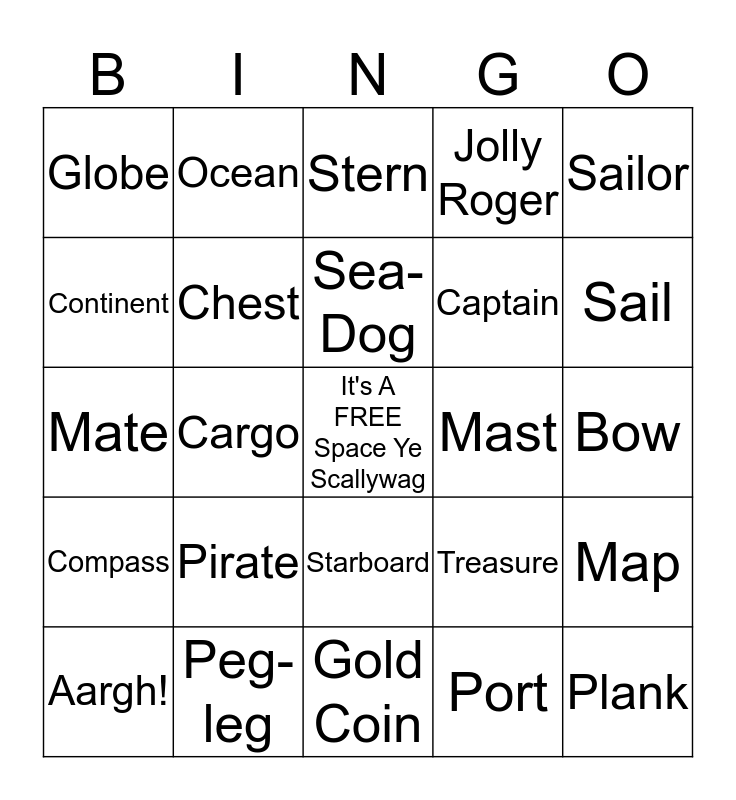 This bingo card has a free space and 24 words: Pirate, Peg-leg, Sea-Dog, Aargh!, Sailor, Globe, Continent, Ocean, Mast, Starboard, Captain, Mate, Treasure, Map, Chest, Port, Bow, Stern, Sail, Cargo, Plank, Compass, Jolly Roger and Gold Coin.