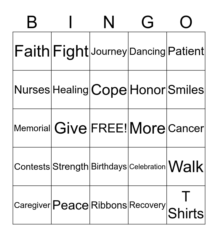 This bingo card has a free space and 24 words: Strength, Peace, Cope, Caregiver, Patient, Faith, Nurses, Fight, More, Birthdays, Honor, Memorial, Celebration, Walk, Healing, Recovery, Cancer, Journey, Smiles, Give, T Shirts, Contests, Dancing and Ribbons.