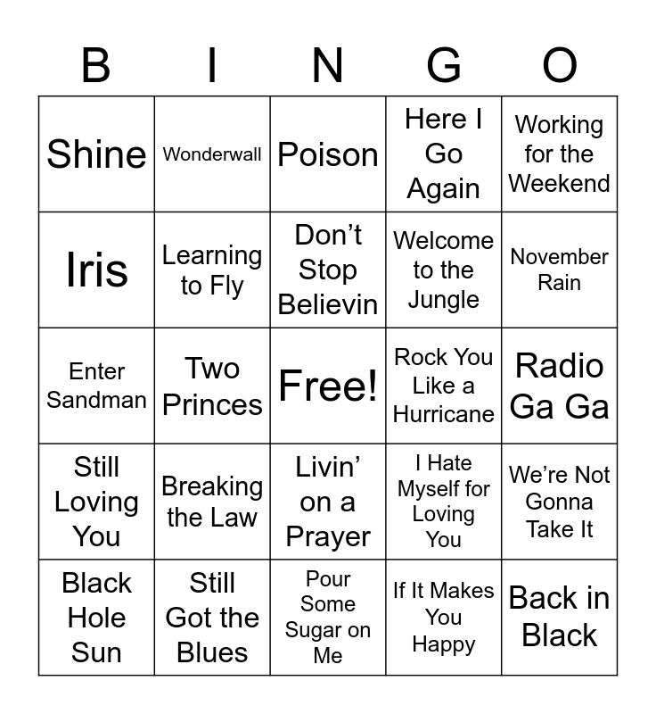 This bingo card has a free space and 98 words: Every Breath You Take, With or Without You, Sweet Child O’ Mine, Radio Ga Ga, Smells Like Teen Spirit, Eye of the Tiger, Open Arms, Losing My Religion, Nothing’s Gonna Stop Us Now, Dancing in the Dark, Walk Like an Egyptian, Under the Bridge, I Want to Know What Love Is, Breaking the Law, Creep, Wonderwall, Enter Sandman, Africa, More Than Words, Loser, Tears in Heaven, Zombie, Faithfully, Total Eclipse of the Heart, Don’t Speak, Shine, Pour Some Sugar on Me, The Final Countdown, Basket Case, Waiting for a Girl Like You, Black Hole Sun, Iris, (Everything I Do) I Do It for You, Died in Your Arms, November Rain, Everlong, Here I Go Again, Got My Mind Set on You, Two Princes, Jeremy, Summer of 69, Don’t Stop Believin, Welcome to the Jungle, Alive, Sara, Livin’ on a Prayer, Money for Nothing, I Don’t Wanna Miss a Thing, Broken Wings, Living After Midnight, Blaze of Glory, Free Fallin, Nothing Else Matters, Always, Right Here Waiting, Turn Me Loose, Still Loving You, Black Velvet, Is This Love, Crazy Train, All I Wanna Do, Lightning Crashes, Please Forgive Me, Bitter Sweet Symphony, What’s Up?, I’ll Be There for You, Keep on Loving You, Run to the Hills, Start Me Up, The Flame, Poison, Holy Diver, If It Makes You Happy, Drive, Every Rose Has It's Thorn, The Unforgiven, Jump, Paradise City, Another One Bites the Dust, Back in Black, Karma Police, Learning to Fly, Still Got the Blues, Crazy, No Rain, You Oughta Know, Semi-Charmed Life, 18 and Life, We’re Not Gonna Take It, Under Pressure, One of Us, I Hate Myself for Loving You, You Give Love a Bad Name, Heaven, Rock You Like a Hurricane, Livin’ on the Edge, Working for the Weekend and Thunderstruck.