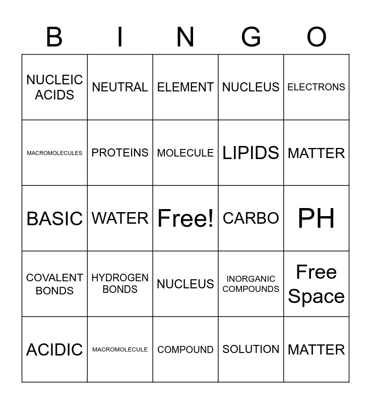 This bingo card has a free space and 50 words: ATOMS, MATTER, ACIDIC, COMPOUND, HYDROGEN BONDS, ORGANIC COMPOUNDS, NEUTRAL, HYDROCARBONS, MACROMOLECULES, BASIC, PROTEINS, NUCLEUS, Free Space, INORGANIC COMPOUNDS, COVALENT BONDS, PH, MOLECULE, CARBO, IONIC BONDS, ELECTRONS, WATER, SOLUTION, NUCLEIC ACIDS, LIPIDS, ELEMENT, IONIC BONDS, MATTER, ATOM, ELEMENT, NUCLEUS, MOLECULE, COMPOUND, HYDROCARBON, SOLLUTION, MACROMOLECULE, PROTEIN, NUCLEIC ACID, CARBOHYDRATE, LIPID, PH, WATER, INORGANIC COMPOUNDS, ORGANIC COMPOUNDS, FREE SPACE, ACIDIC, BASIC, NEUTRAL, IONIC BONDS, COVALENT BONDS and HYDROGEN BONDS.