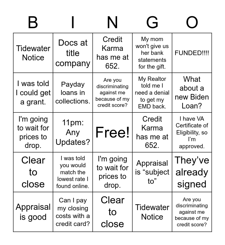 This bingo card has a free space and 96 words: Free Space: What's your rate?, I have VA Certificate of Eligibility, so I’m approved., I saw online that Rates went down., Credit Karma has me at 652., It’s my money, it doesn’t matter where it comes from., Screenshots as “Documents”, I was told you would match the lowest rate I found online., My Realtor told me I need a denial to get my EMD back., Can I pay my closing costs with a credit card?, 11pm: Any Updates?, I'm just rate shopping, can you send me 12 more scenarios?, Quit job before closing, Recurring debits at ABC and Lotto, What about a new Biden Loan?, Payday loans in collections., I was told I could get a grant., Are you discriminating against me because of my credit score?, You don’t need that document., I have A+ credit so I deserve a lower rate., Well, my dad said..., My agent said to ask you for a lender credit to cover closing cost., Sorry you're at a funeral, I'll make this quick., My mom won't give us her bank statements for the gift., Finally gets docs. Half of them have SSN blacked out., I'm going to wait for prices to drop., Clear to close, Docs at title company, Tidewater Notice, Named storm in the gulf, Insurance is bound, Appraisal is good, Appraisal is “subject to”, No contingencies, She easily qualifies!, FUNDED!!!!, Your check is ready, They’ve already signed, We have everything, I have a referral for you, 11pm: Any Updates?, Appraisal is “subject to”, Appraisal is good, Are you discriminating against me because of my credit score?, Can I pay my closing costs with a credit card?, Clear to close, Credit Karma has me at 652., Docs at title company, Finally gets docs. Half of them have SSN blacked out., FUNDED!!!!, I have a referral for you, I have A+ credit so I deserve a lower rate., I have VA Certificate of Eligibility, so I’m approved., I saw online that Rates went down., I was told I could get a grant., I was told you would match the lowest rate I found online., I'm going to wait for prices to drop., I'm just rate shopping, can you send me 12 more scenarios?, Insurance is bound, It’s my money, it doesn’t matter where it comes from., My agent said to ask you for a lender credit to cover closing cost., My mom won't give us her bank statements for the gift., My Realtor told me I need a denial to get my EMD back., Named storm in the gulf, No contingencies, Payday loans in collections., Quit job before closing, 11pm: Any Updates?, You don’t need that document., We have everything, Tidewater Notice, They’ve already signed, Sorry you're at a funeral, I'll make this quick., She easily qualifies!, Screenshots as “Documents”, Can I pay my closing costs with a credit card?, Are you discriminating against me because of my credit score?, Quit job before closing, Payday loans in collections., No contingencies, My Realtor told me I need a denial to get my EMD back., My mom won't give us her bank statements for the gift., My agent said to ask you for a lender credit to cover closing cost., It’s my money, it doesn’t matter where it comes from., Insurance is bound, I'm just rate shopping, can you send me 12 more scenarios?, I'm going to wait for prices to drop., I was told you would match the lowest rate I found online., I was told I could get a grant., I saw online that Rates went down., I have VA Certificate of Eligibility, so I’m approved., I have A+ credit so I deserve a lower rate., I have a referral for you, FUNDED!!!!, Finally gets docs. Half of them have SSN blacked out., Docs at title company and Credit Karma has me at 652..