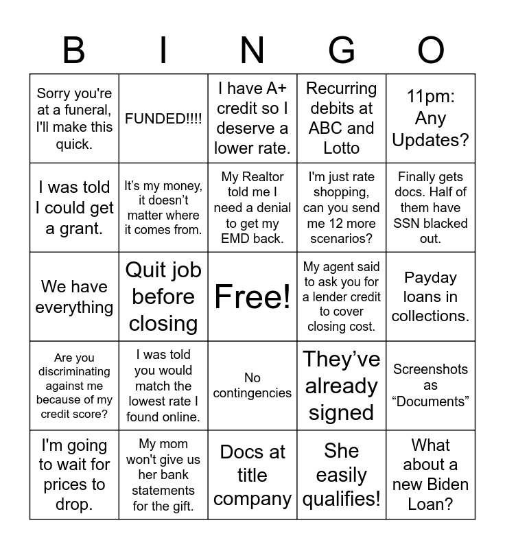 This bingo card has a free space and 38 words: I have VA Certificate of Eligibility, so I’m approved., I saw online that Rates went down., Credit Karma has me at 652., It’s my money, it doesn’t matter where it comes from., Screenshots as “Documents”, I was told you would match the lowest rate I found online., My Realtor told me I need a denial to get my EMD back., Can I pay my closing costs with a credit card?, 11pm: Any Updates?, I'm just rate shopping, can you send me 12 more scenarios?, Quit job before closing, Recurring debits at ABC and Lotto, What about a new Biden Loan?, Payday loans in collections., I was told I could get a grant., Are you discriminating against me because of my credit score?, You don’t need that document., I have A+ credit so I deserve a lower rate., Well, my dad said..., My agent said to ask you for a lender credit to cover closing cost., Sorry you're at a funeral, I'll make this quick., My mom won't give us her bank statements for the gift., Finally gets docs. Half of them have SSN blacked out., I'm going to wait for prices to drop., Clear to close, Docs at title company, Tidewater Notice, Named storm in the gulf, Insurance is bound, Appraisal is good, Appraisal is “subject to”, No contingencies, She easily qualifies!, FUNDED!!!!, Your check is ready, They’ve already signed, We have everything and I have a referral for you.