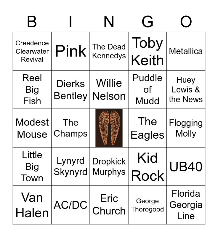 This bingo card has a free space and 30 words: AC/DC, Afroman, The Champs, Chris Stapleton, Creedence Clearwater Revival, The Dead Kennedys, Dierks Bentley, Dropkick Murphys, The Eagles, Eric Church, Flogging Molly, Florida Georgia Line, George Thorogood, Green Day, Huey Lewis & the News, Jimmy Buffett, Kid Rock, Little Big Town, Lynyrd Skynyrd, Metallica, Modest Mouse, Nathaniel Rateliff, Pink, Puddle of Mudd, Reel Big Fish, Toby Keith, UB40, Van Halen, Willie Nelson and ZZ Top.