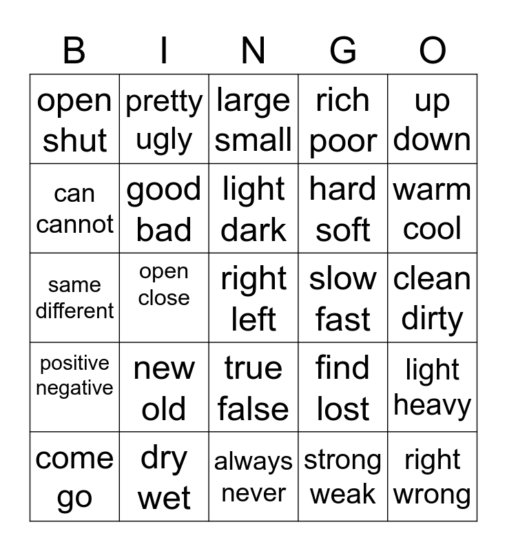 This bingo card has a free space and 29 words: come go, short tall, open close, start stop, open shut, large small, good bad, new old, slow fast, dry wet, clean dirty, right wrong, always never, strong weak, warm cool, hot cold, true false, positive negative, up down, same different, find lost, easy difficult, hard soft, can cannot, rich poor, pretty ugly, light heavy, light dark and boring exciting.