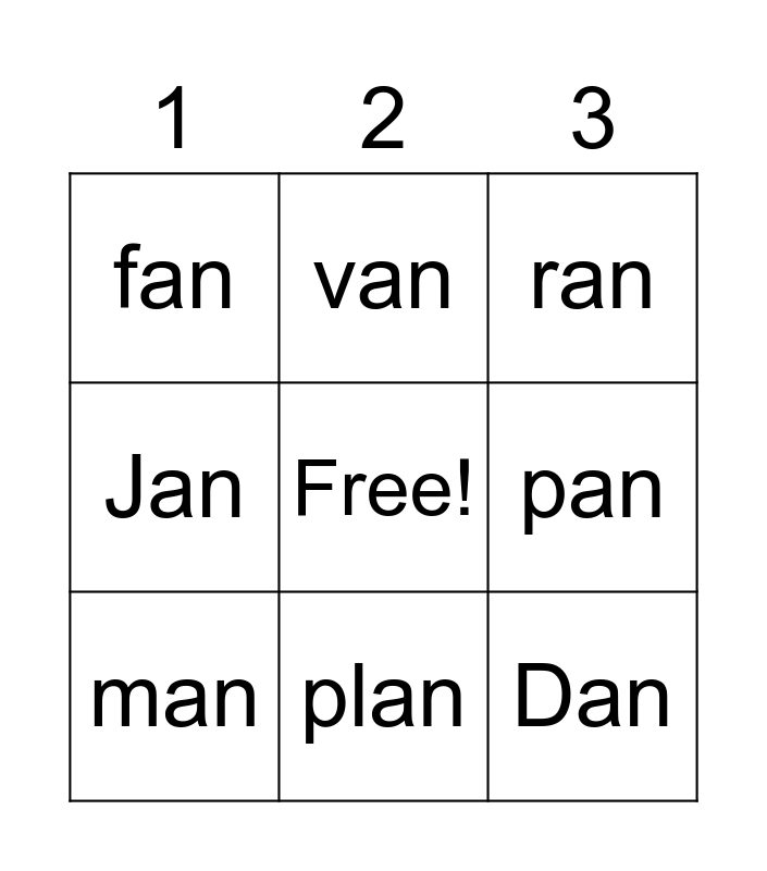 This bingo card has a free space and 8 words: pan, ran, van, man, fan, Dan, Jan and plan.