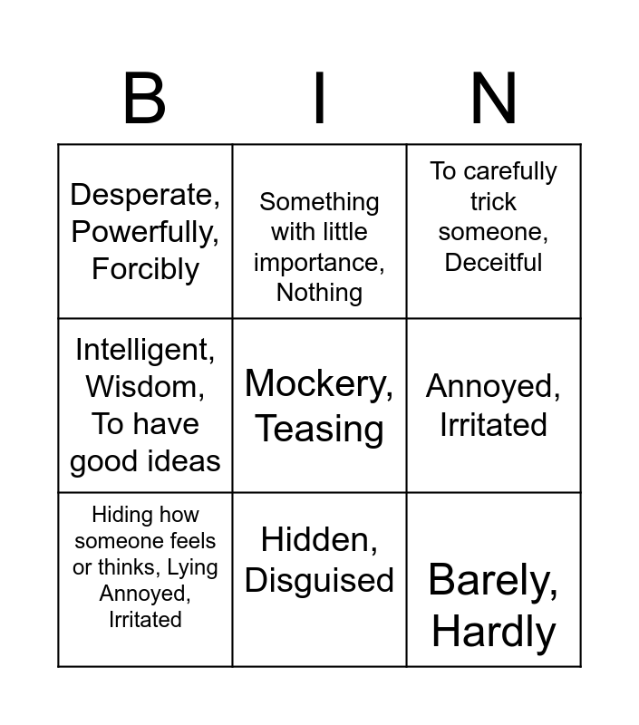 This bingo card has 9 words: Hiding how someone feels or thinks, Lying Annoyed, Irritated, To carefully trick someone, Deceitful, Something with little importance, Nothing, Intelligent, Wisdom, To have good ideas, Desperate, Powerfully, Forcibly, Annoyed, Irritated, Mockery, Teasing, Barely, Hardly and Hidden, Disguised.