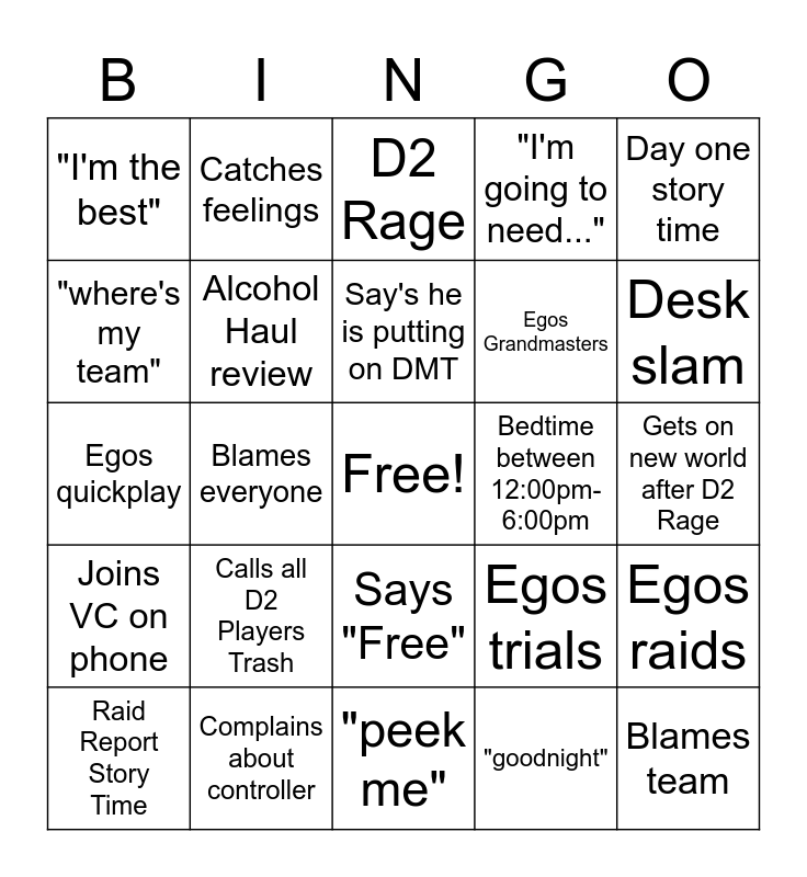 This bingo card has a free space and 24 words: Calls all D2 Players Trash, Complains about controller, Say's he is putting on DMT, Raid Report Story Time, Day one story time, "I'm the best", "where's my team", Catches feelings, Bedtime between 12:00pm-6:00pm, Says "Free", Egos Grandmasters, Egos quickplay, Egos trials, Egos raids, Alcohol Haul review, "goodnight", Gets on new world after D2 Rage, D2 Rage, Desk slam, Blames everyone, Blames team, Joins VC on phone, "I'm going to need..." and "peek me".