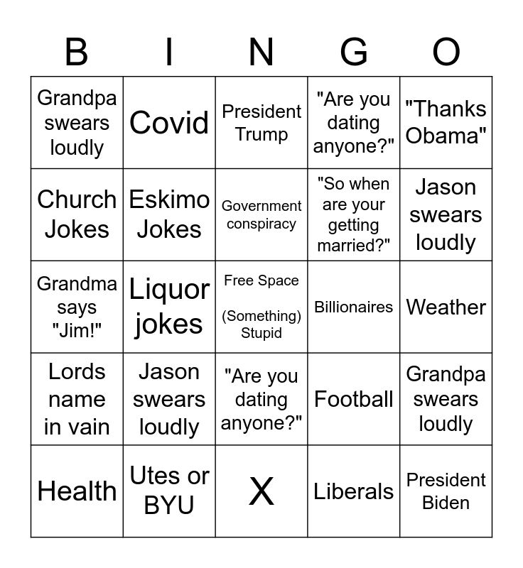 This bingo card has a free space and 24 words: Jason swears loudly, Utes or BYU, Government conspiracy, Health, "Thanks Obama", Grandpa swears loudly, Church Jokes, Covid, Billionaires, "Are you dating anyone?", "So when are your getting married?", Grandma says "Jim!", Football, Grandpa swears loudly, Eskimo Jokes, Liberals, Weather, President Trump, Jason swears loudly, Liquor jokes, President Biden, Lords name in vain, "Are you dating anyone?" and X.