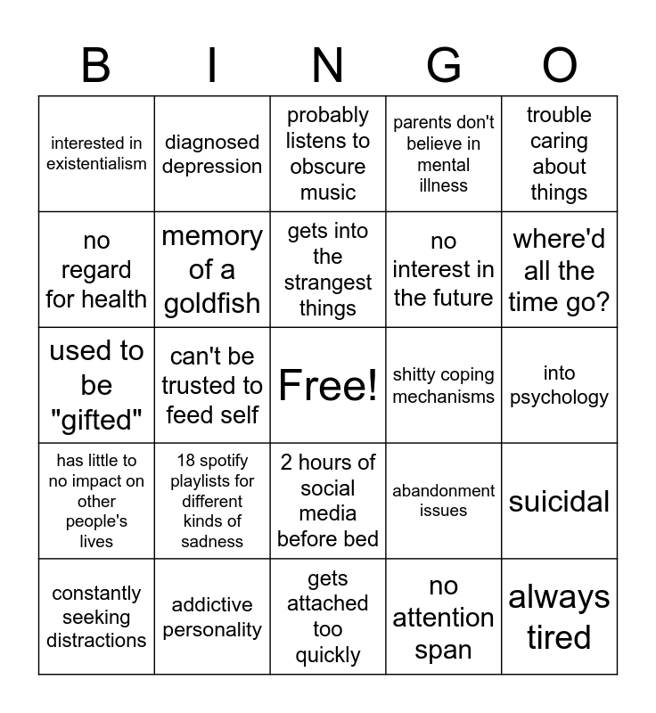 This bingo card has a free space and 24 words: 18 spotify playlists for different kinds of sadness, addictive personality, gets into the strangest things, constantly seeking distractions, trouble caring about things, interested in existentialism, no regard for health, diagnosed depression, shitty coping mechanisms, 2 hours of social media before bed, no interest in the future, used to be "gifted", abandonment issues, suicidal, memory of a goldfish, no attention span, into psychology, probably listens to obscure music, where'd all the time go?, can't be trusted to feed self, always tired, has little to no impact on other people's lives, parents don't believe in mental illness and gets attached too quickly.