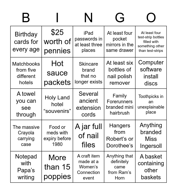 This bingo card has a free space and 24 words: Food or meds with expiry before 1980, More than 15 poppies, Skincare brand that no longer exists, Notepad with Papa’s writing, At least four test-strip bottles filled with something other than test-strips, Birthday cards for every age, Matchbooks from five different hotels, $25 worth of pennies, Family Forerunners branded mini hairbrush, A jar full of nail files, At least six bottles of nail polish remover, A towel you can see through, Hangers from Robert’s or Dorothee’s, Anything branded Miss Ingersoll, Hot sauce packets, Anything that definitely came from Ram’s Horn, Toothpicks in an unexplainable place, iPad passwords in at least three places, Computer software install discs, Holy Land hotel “souvenirs”, A basket containing other baskets, The massive Crayola carrying case, At least four pocket mirrors in the same drawer and A craft item made at a Women’s Connection event.