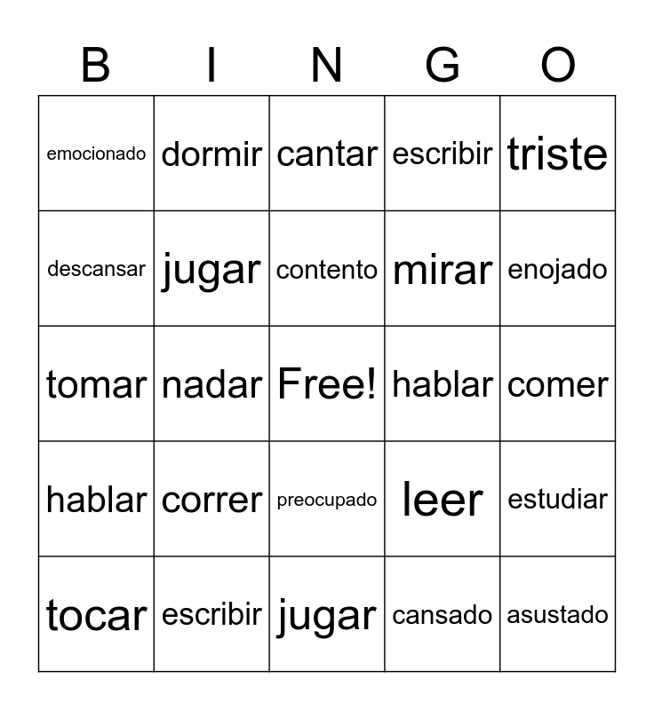 This bingo card has a free space and 24 words: correr, escribir, contento, tocar, triste, emocionado, descansar, dormir, hablar, preocupado, mirar, tomar, leer, estudiar, jugar, cansado, comer, cantar, enojado, nadar, asustado, hablar, escribir and jugar.
