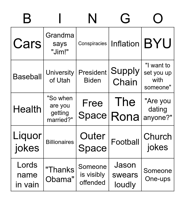 This bingo card has a free space and 32 words: Jason swears loudly, Grandpa swears loudly, "So when are you getting married?", Eskimo jokes, Liquor jokes, University of Utah, BYU, Church jokes, Grandma says "Jim!", Liberals, President Biden, Conspiracies, Mission stories, Alaska, The Rona, Weather, Lords name in vain, Health, Outer Space, Billionaires, Football, President Trump, "Are you dating anyone?", "Thanks Obama", Someone One-ups, Inflation, Supply Chain, Baseball, Cars, Someone is visibly offended, Vacation/Trips and "I want to set you up with someone".