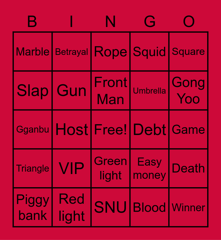 This bingo card has 40 words: Dalgona, Gganbu, Doll, Gun, Red light, Green light, Front Man, Circle, Square, Triangle, Host, Squid, Free!, Game, Debt, VIP, Oxygen tank, Marble, Tug of War, Rope, Death, Blood, Umbrella, Slap, Straw, Coffee, Card, 456 Billion Won, Winner, Tempered Glass, Time, Piggy bank, Cigarette, Easy money, Gong Yoo, SNU, Life, Invitation, Betrayal and Lighter.