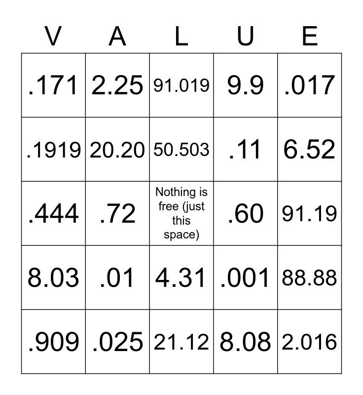 This bingo card has a free space and 24 words: .01, .025, 50.503, .909, .017, .171, .1919, 2.25, .60, 4.31, .11, .444, .001, 88.88, 20.20, 8.08, 91.19, 91.019, 6.52, .72, 2.016, 8.03, 9.9 and 21.12.