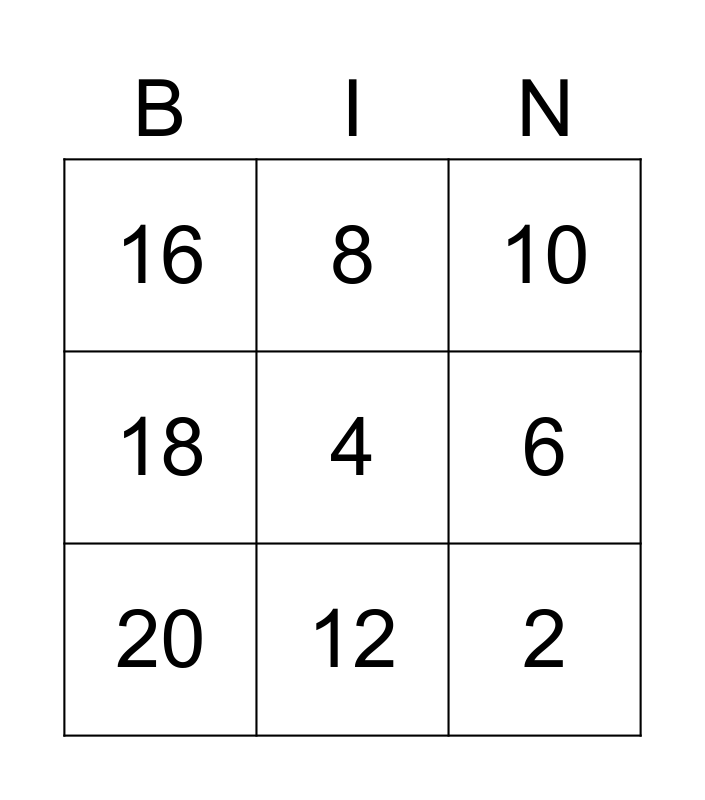 This bingo card has 12 words: 0, 2, 4, 6, 8, 10, 12, 14, 16, 18, 20 and 22.
