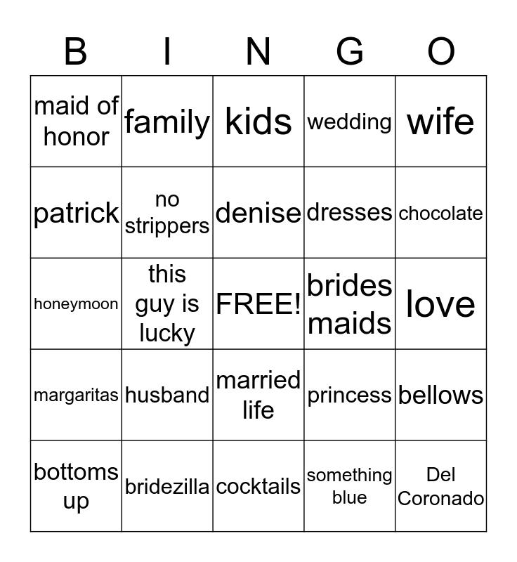 This bingo card has a free space and 24 words: husband, bridezilla, denise, bottoms up, wife, maid of honor, patrick, family, brides maids, married life, dresses, honeymoon, princess, bellows, no strippers, something blue, love, kids, chocolate, this guy is lucky, Del Coronado, margaritas, wedding and cocktails.