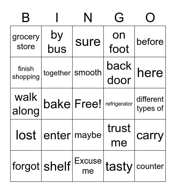 This bingo card has a free space and 29 words: forgot, finally, bake, some, grocery store, sure, together, enter, refrigerator, shelf, different types of, counter, Excuse me, tasty, here, across from, maybe, lost, before, walk along, trust me, Why don't we~?, back door, finish shopping, on foot, by bus, carry, smooth and bumpy.